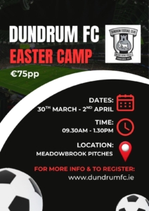 Dundrum FC Easter Camp 202626 February 2026/in All News/by Barry O'SheaOur Easter 2026 Camp is open for booking. Book your place here or on the camp flyer below to book your spot! https://www.dundrumfc.ie/wp-content/uploads/2025/03/Dundrum-FC-logo1-1.png 0 0 Barry O'Shea https://www.dundrumfc.ie/wp-content/uploads/2025/03/Dundrum-FC-logo1-1.png Barry O'Shea2026-02-26 18:23:582026-02-26 18:35:48Dundrum FC Easter Camp 2026